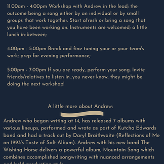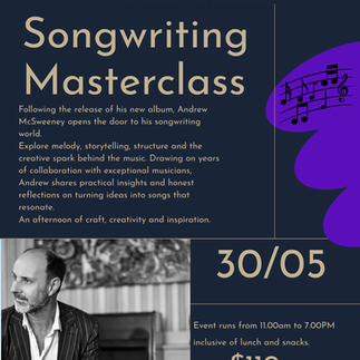 Song writing aspirant? Let Andrew give you skills and encouragement to bring your ideas to fruition. See brochure for details.